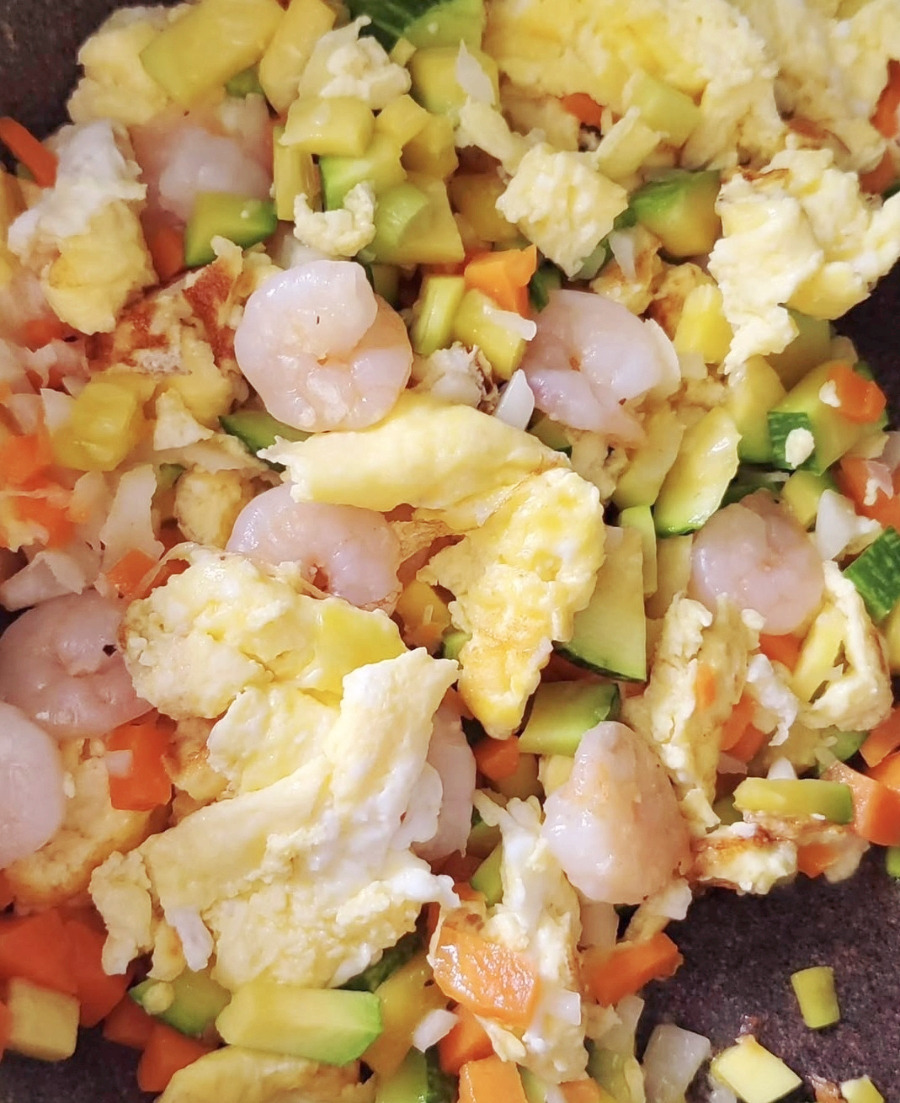 팬 한쪽을 볶은 새우와 채소들을 몰아두고 빈 공간에 계란을 풀어 스크램블처럼 휘저어 주세요.