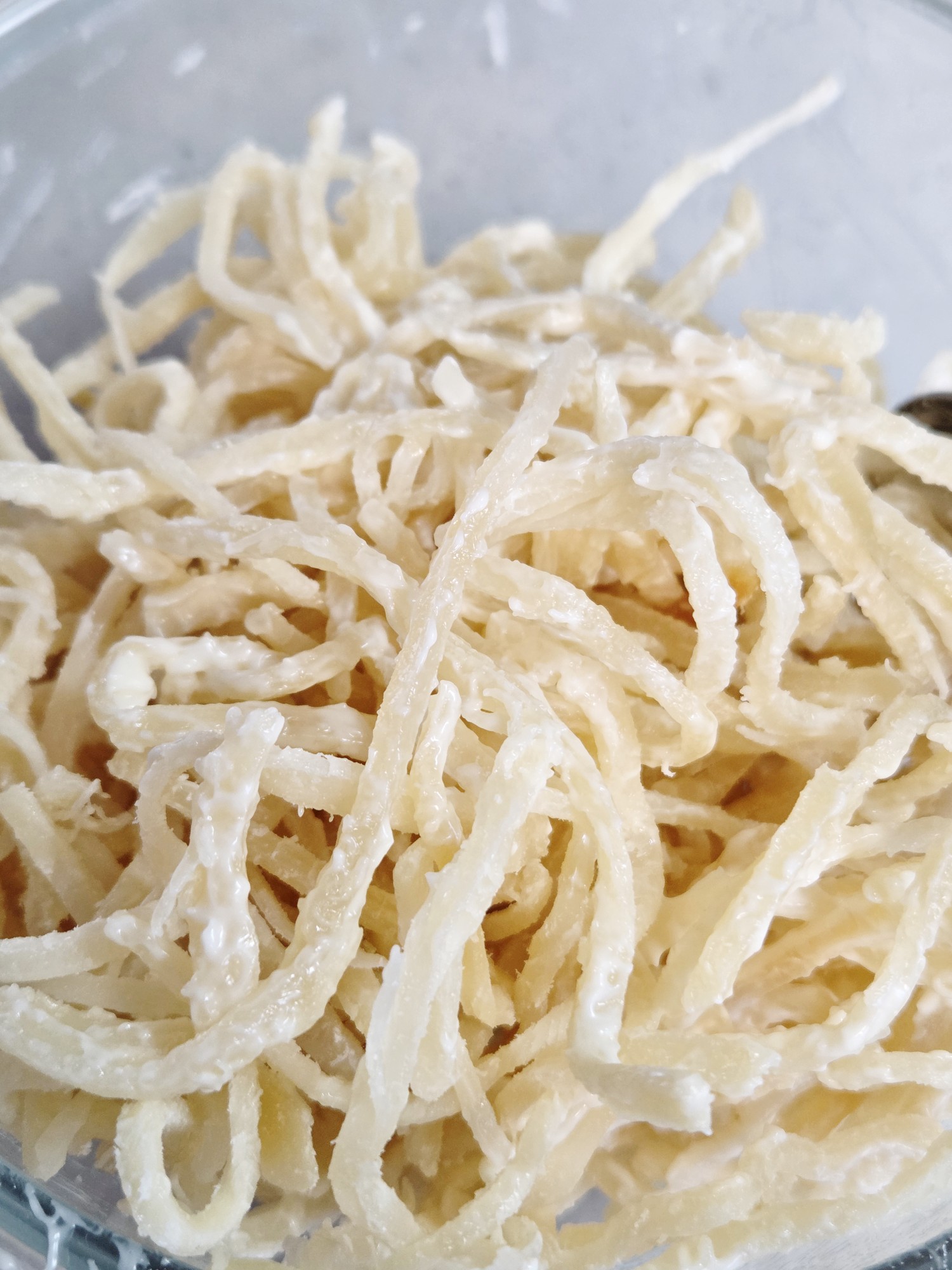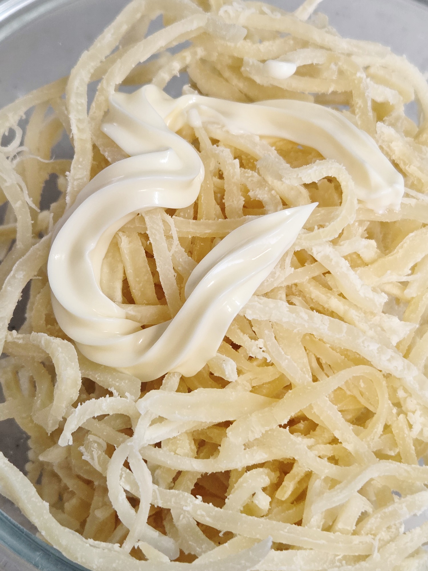 마른 오징어채에 마요네즈를 넣고 고루 섞어준다.